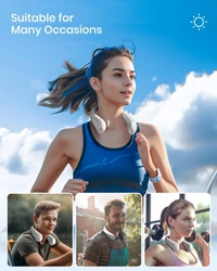 - Headphones and leafless unique design, stylish and cool without tangling your hair. Upgrading 60 air outlets up and down, the 360° surround air volume increased by 90%. The turbo motors on both sides operate efficiently, cooling down from the neck to the face within 3 seconds, and the wind is gentle and cool.