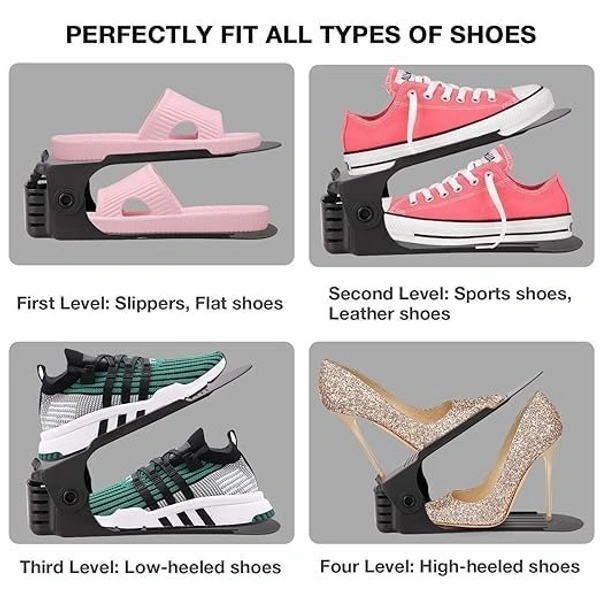 - The shoe slots has adjustable height levels, You can adjust according to the type of shoes, ensure not squeeze, destroy shoes, suitable for most children's shoes, sports shoes, slippers, flat shoes, sandals, high heels.